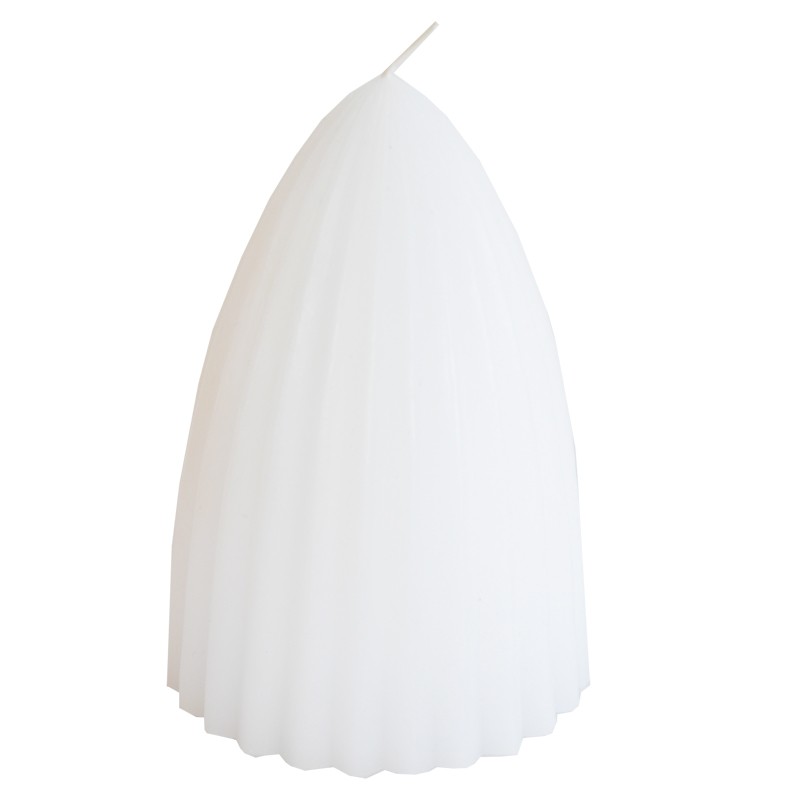 Valkoinen kartiokynttilä, raitakuvio pystysuunnassa.