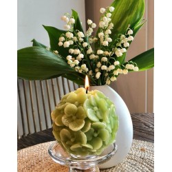 Pyöreä kynttilä, jossa kukka kohokuviota.
