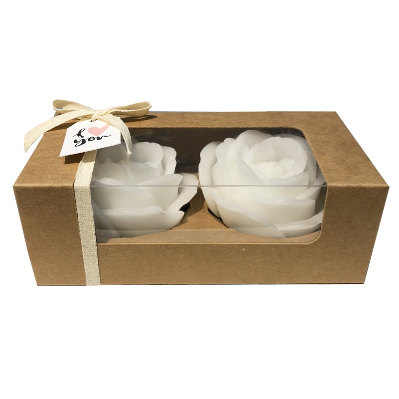 Kaksi valkoista ruusukynttilää lahjarasiassa.