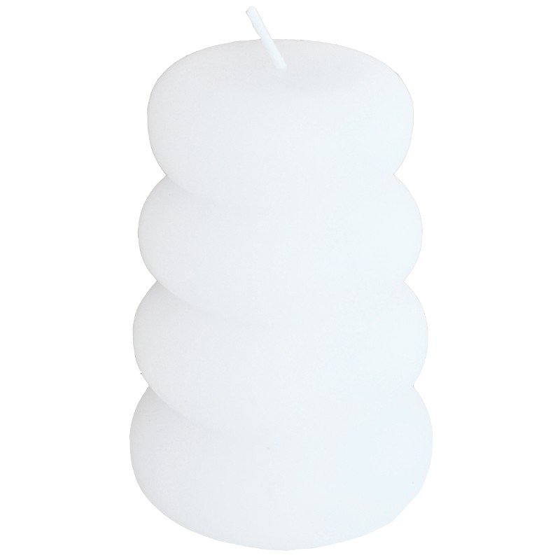 Valkoinen kynttilä, jossa neljö pyöreää "laattaa" kasassa.