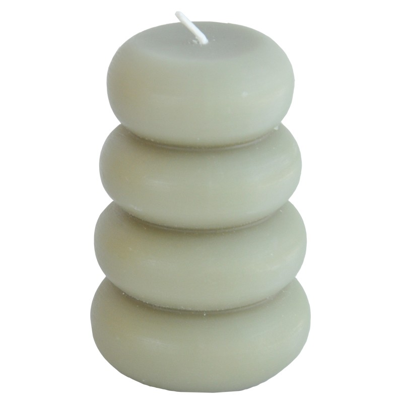 Vihreä kynttilä, jossa neljö pyöreää "laattaa" kasassa.Kaunis mattapintainen sävy.