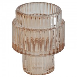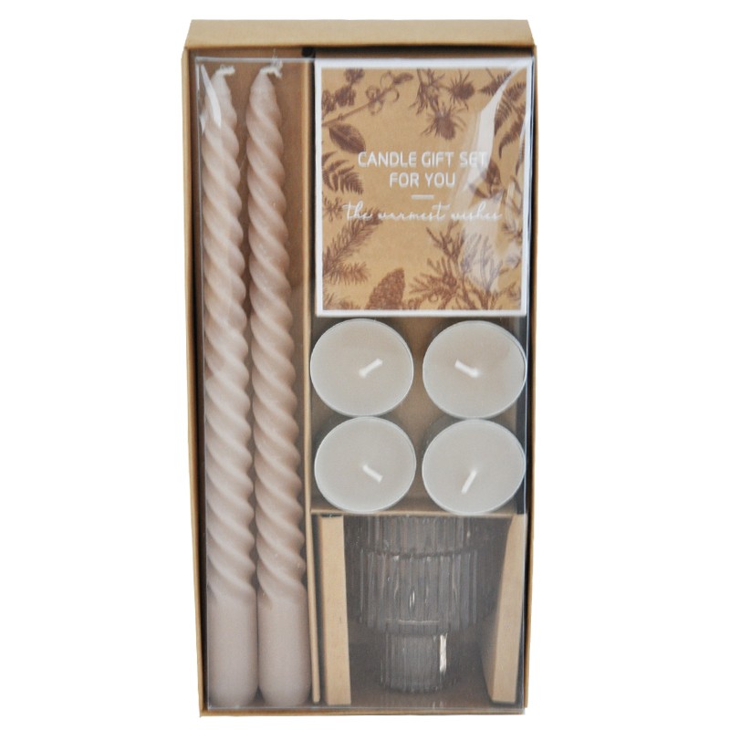 Valmis lahjapakkaus, jossa beige kynttilälasi, kaksi antiikkikynttilääa ja neljä metallikuorista tuikkua.