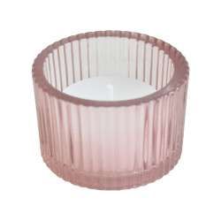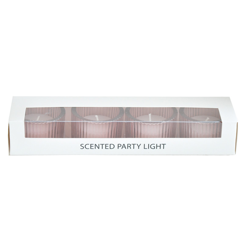 Neljä vaaleanpunaista lasia, joissa sisällä valmiina lämpökynttilät.