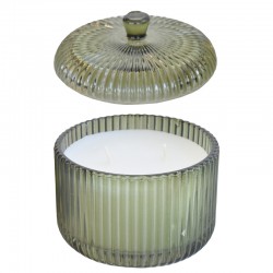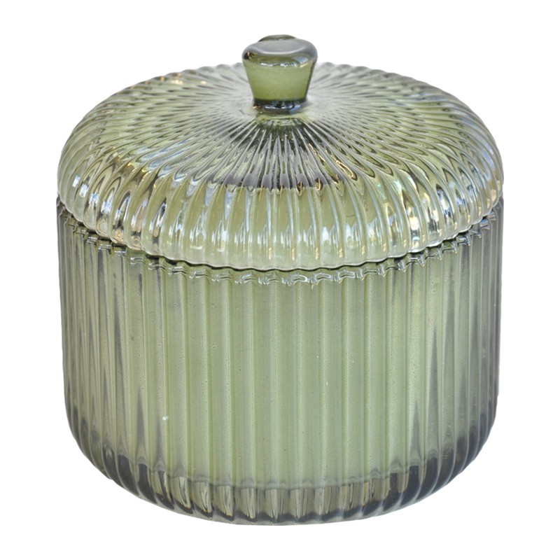 Läpikuultava lasikynttilä, jossa irrallinen kansi.