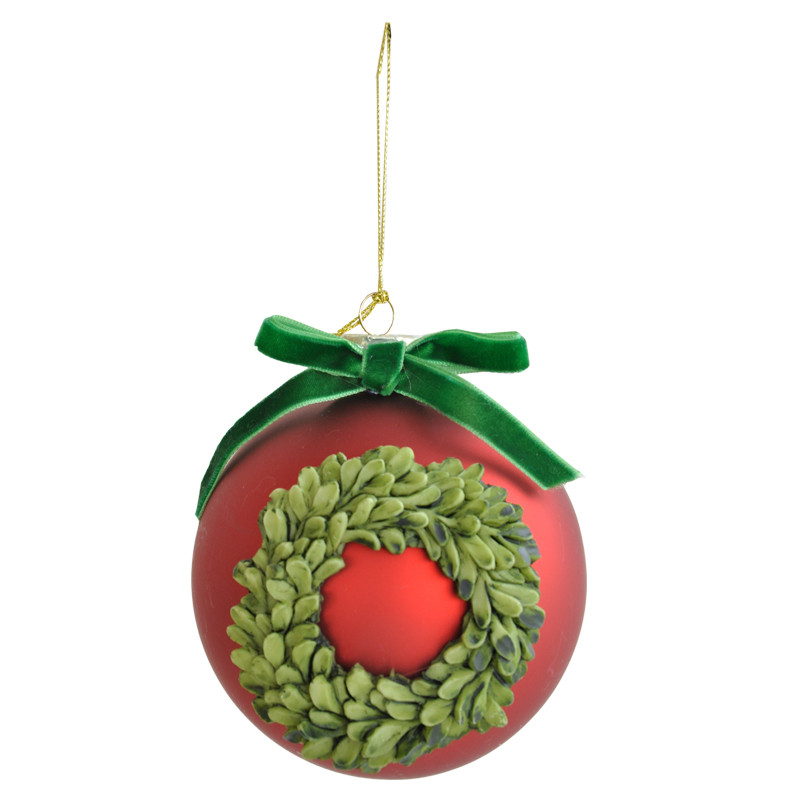 Punainen kuusenkoriste, jossa vihreä kranssikuvio ja samettinen rusetti.