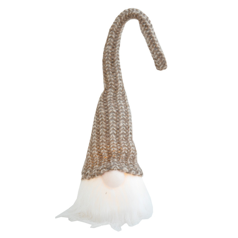 Kankainen tonttu koriste, jossa sisällä led-valo.