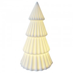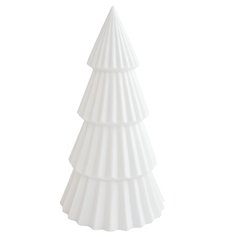 Keraaminen raitakuvioinen kuusikoriste, jossa lämpimänsävyinen led-valo.