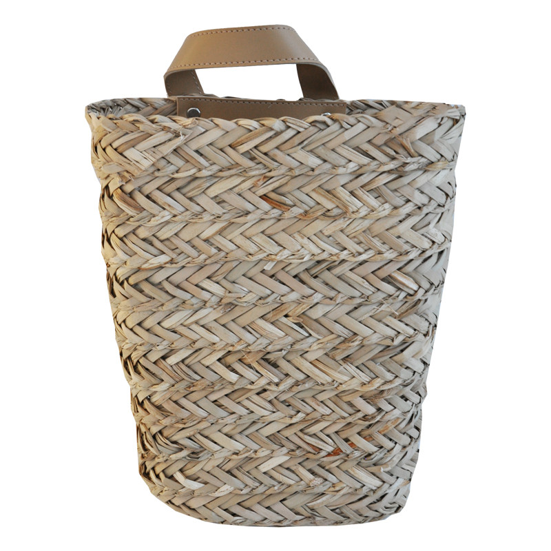 Kaislakasvista valmistettu kori, jossa keinonahkainen kahva.
