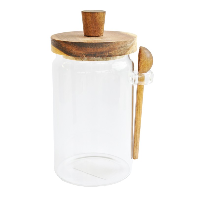 Pieni lasipurkki, jossa puinen kansi ja mittalusikka.Kannessa tiiviste.