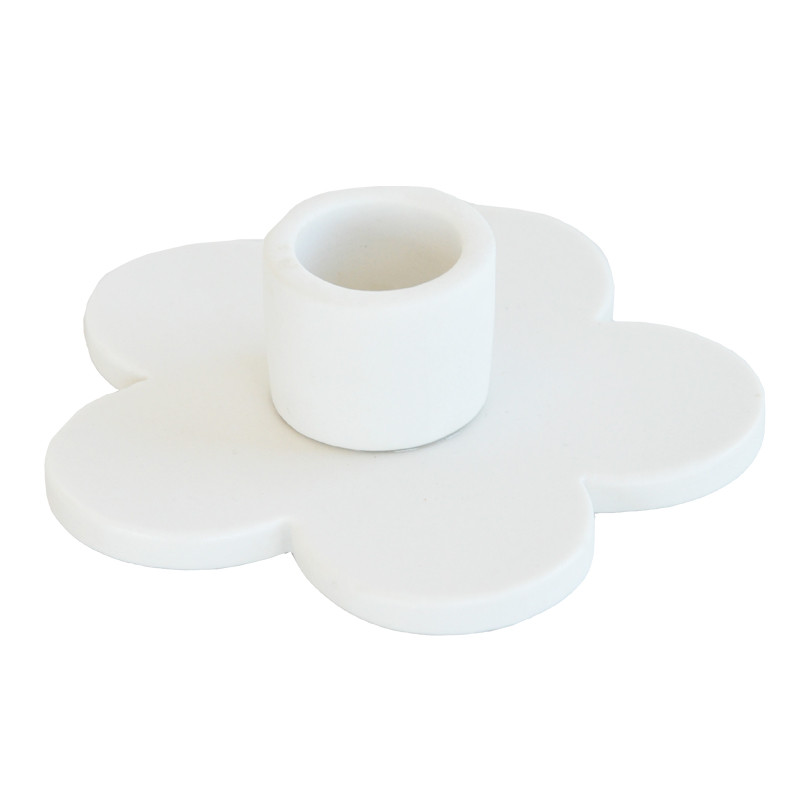 Kukanmuotoinen valkoinen antiikkikynttilänjalka.