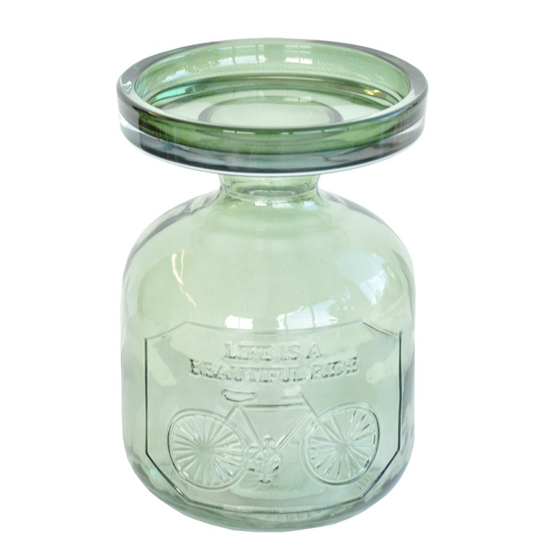 Vihreä kynttilänjalka. Lasissa painettu kuvio, jossa polkupyörä ja teksti "Life is a beautiful ride".