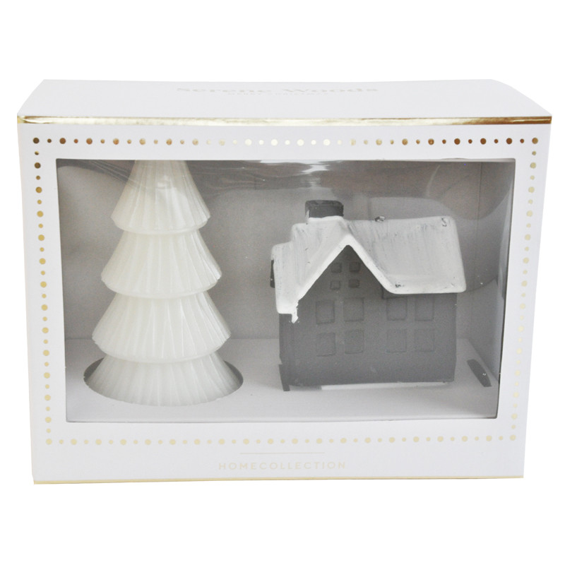 Valmis lahjapakkaus, jossa kaksi kynttilää.