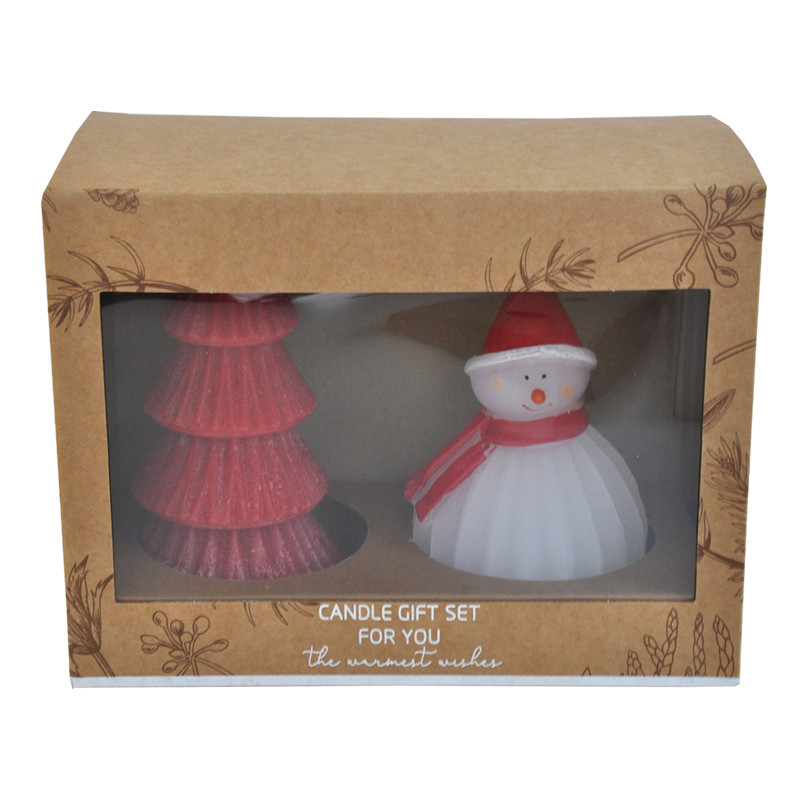 Valmis lahjapakkaus, jossa kaksi kynttilää.