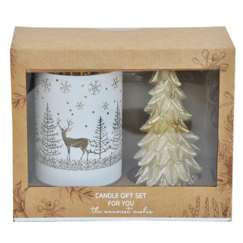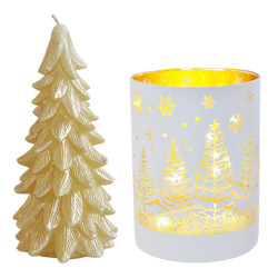 Valmis lahjapakkaus, jossa kultainen kuusikynttilä ja kuvioitu led-lasi.