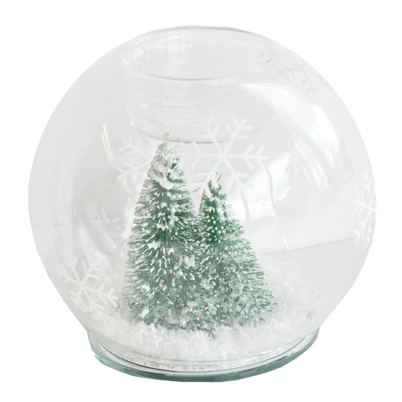 Pyöreä lämpökynttilälasi, jossa sisällä kaksi kuusta sekä lumi koristetta.Lasissa hiutalekuviota.