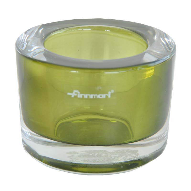 Oliivinvihreä lasi lämpökynttilälle. Kynttilän valo loistaa kauniisti lasin läpi.