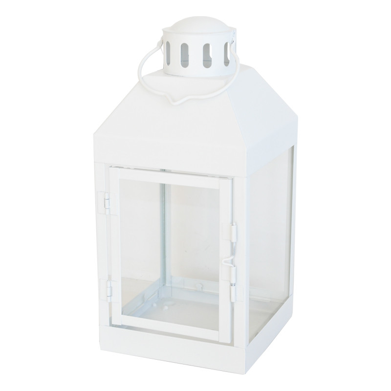 Metallinen talolyhty, jossa edestä aukeava luukku ja jokaisella sivulla lasit.