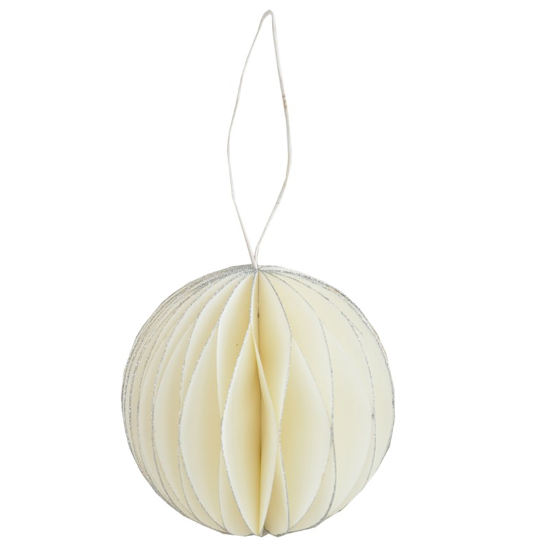 Valkoinen paperikoriste, jossa hopeaa glitteriä.