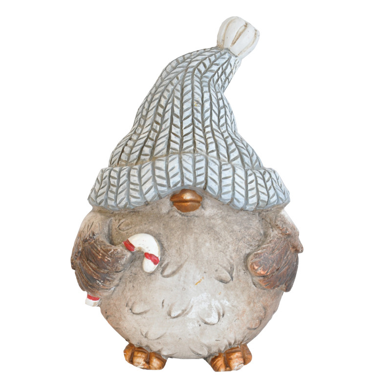 Pieni lintu koriste, jolla hattu silmillä ja joulukaramelli "kädessä".