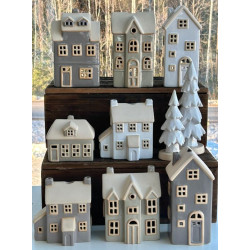 Keraaminen kuusikoriste, jossa beige jalka ja valkoinen kuusi.
