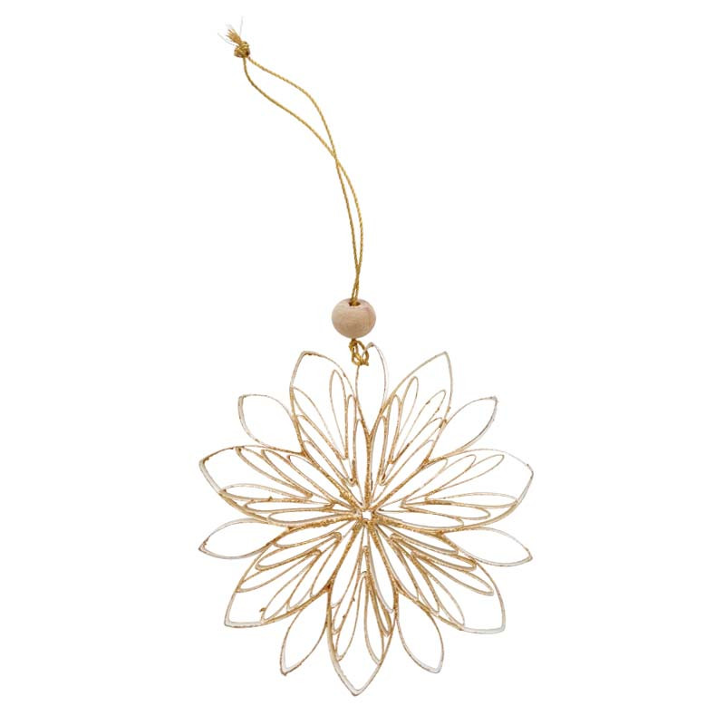Ripustettava kukkamainen koriste, jossa kultaista glitteriä.