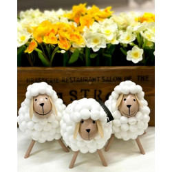 Pehmeä lammaskoriste, jossa puiset jalat.