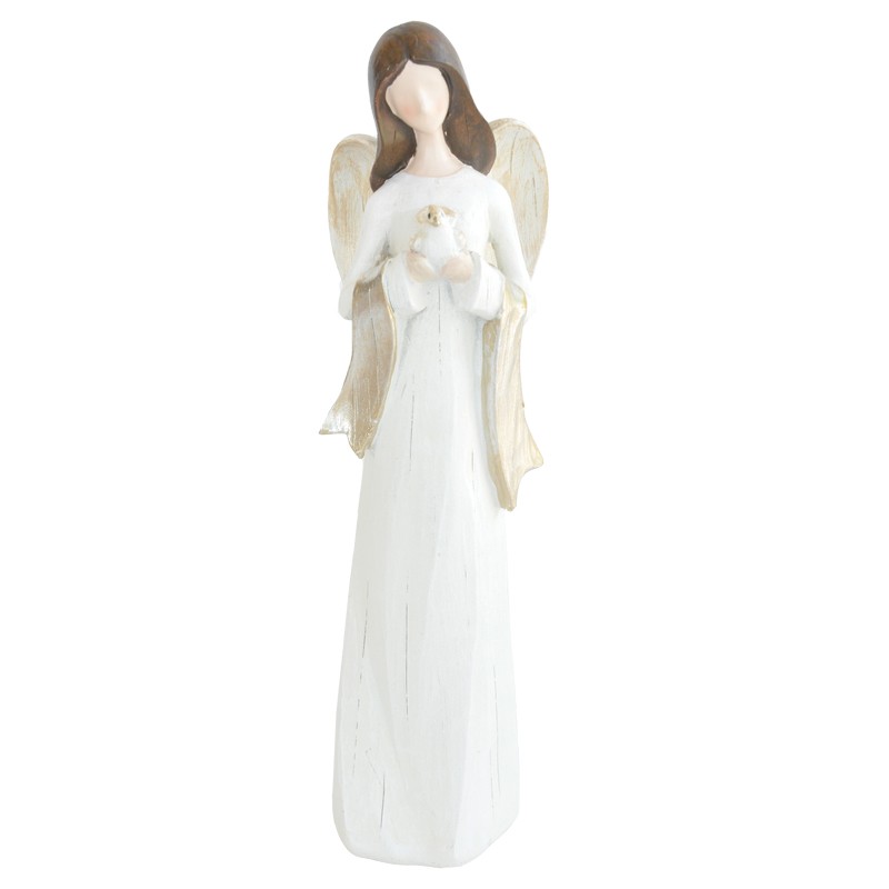 Valkoinen enkeli koriste, jolla kultaiset siivet.Enkeli pitää käsissään kyyhkystä.