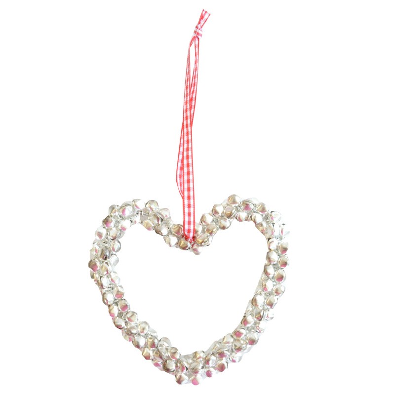 Pieni sydänkoriste, jossa kilisevät kulkuset.Puna/valko ruudullinen ripustusnauha.