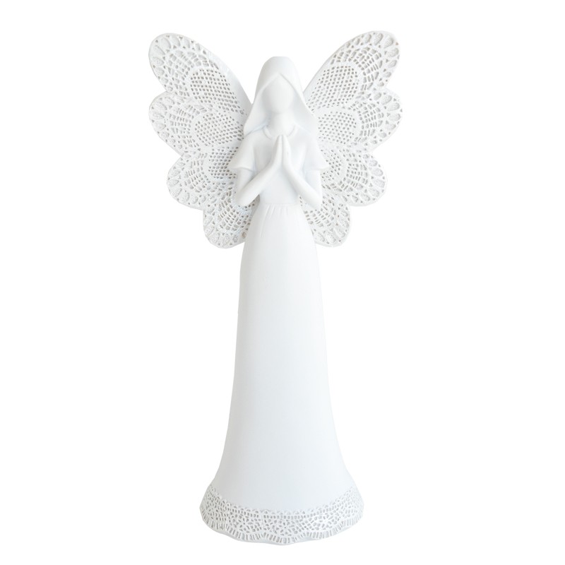 Valkoinen enkeli koriste, jonka siivet pitsikoristeltu.