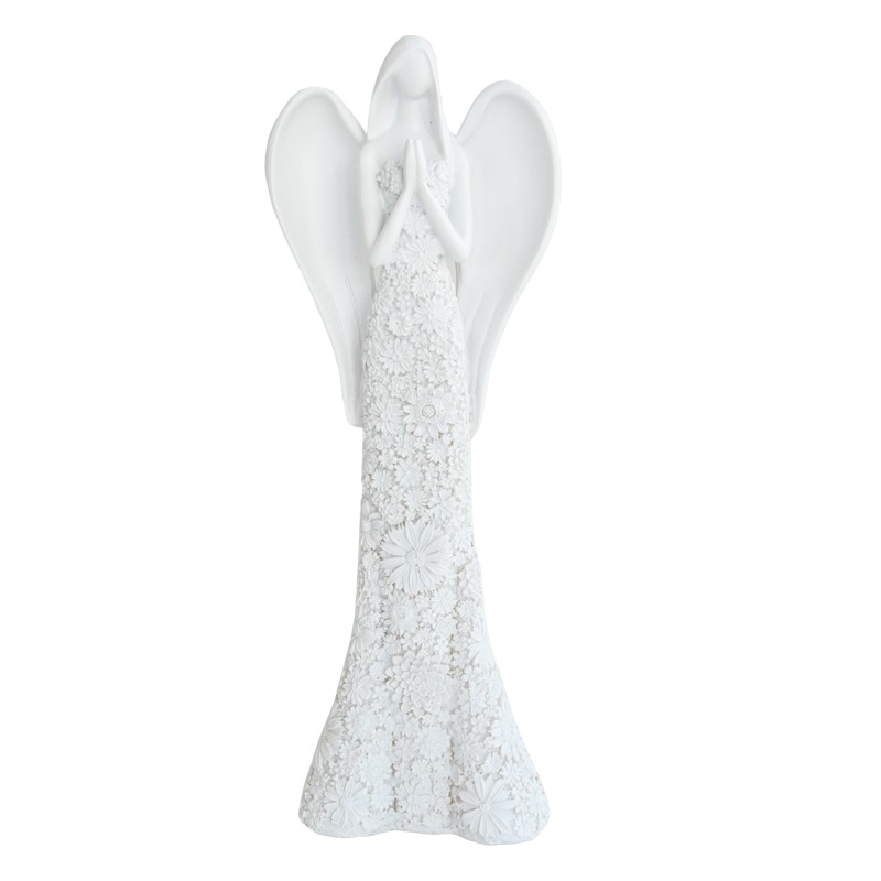 Valkoinen enkeli koriste, jolla kukkakuvioitu mekko.