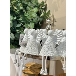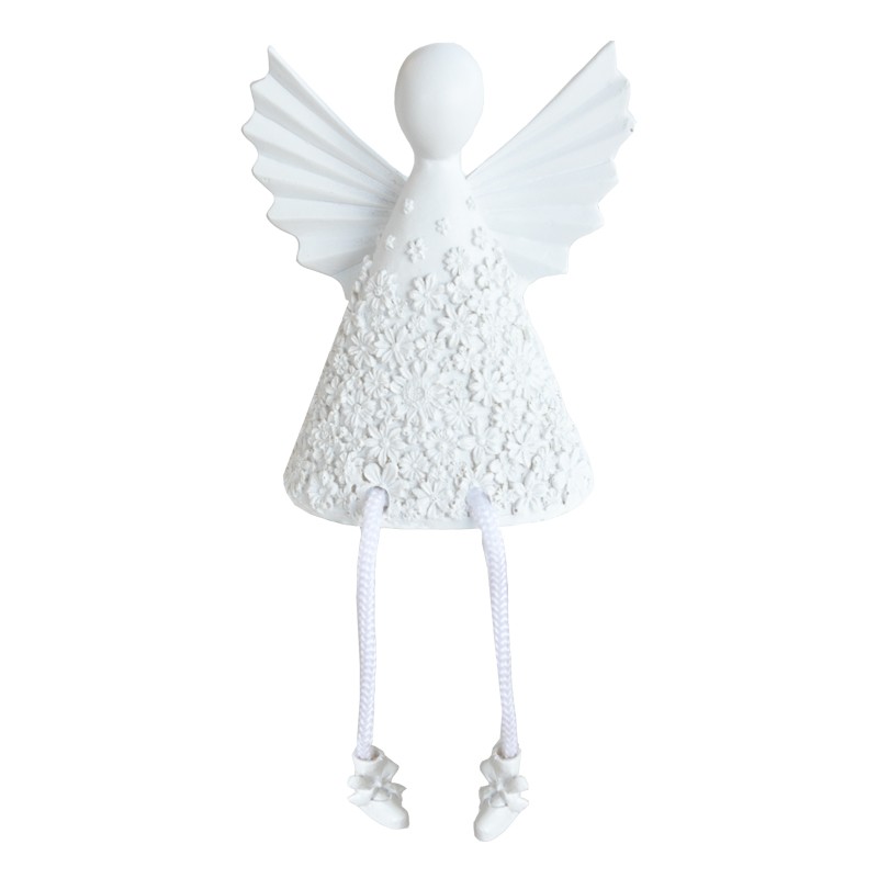 Valkoinen enkeli koriste, minkä saa istumaan esim. hyllyn reunalle.