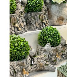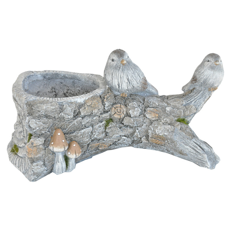 Iso keraaminen puun kantoa muistuttava ruukku, jossa kiinni kaksi lintua ja alareunassa sieniä.