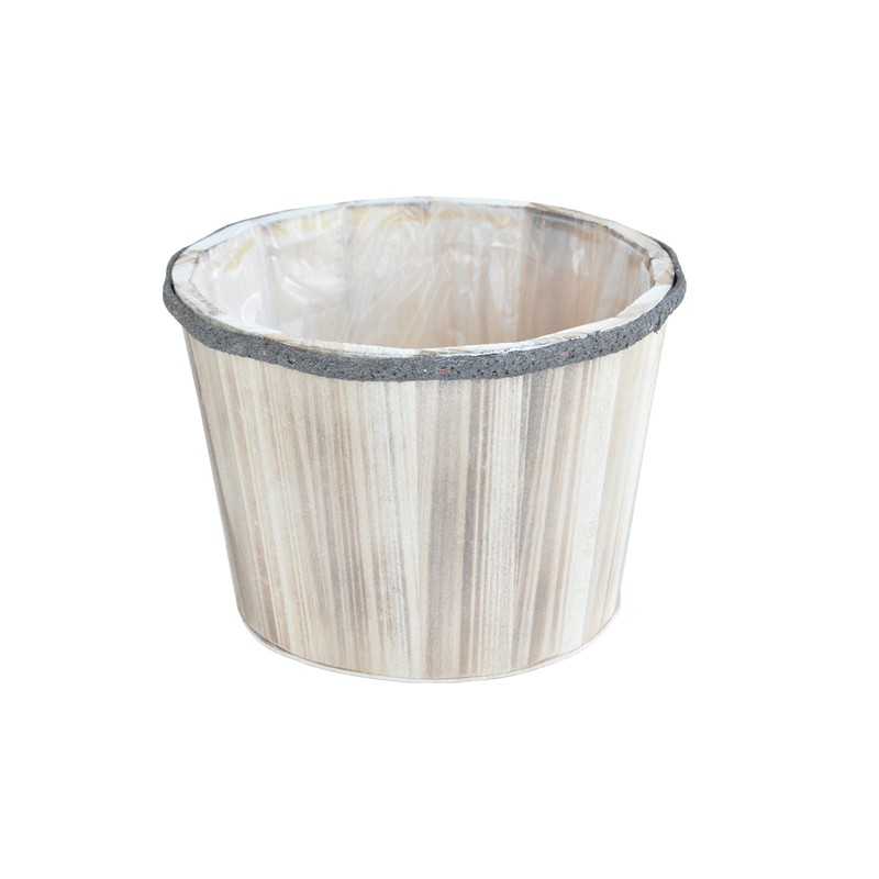 Pyöreä puinen ruukku. Aukon halkaisija ylhäältä noin 11 cm.Sisäpuolella muovisuoja.