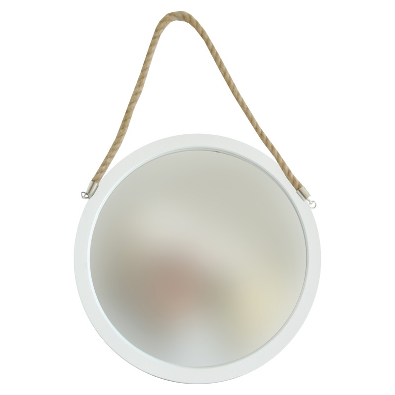 Pyöreä puinen seinäpeili, jossa juuttiköysi.
