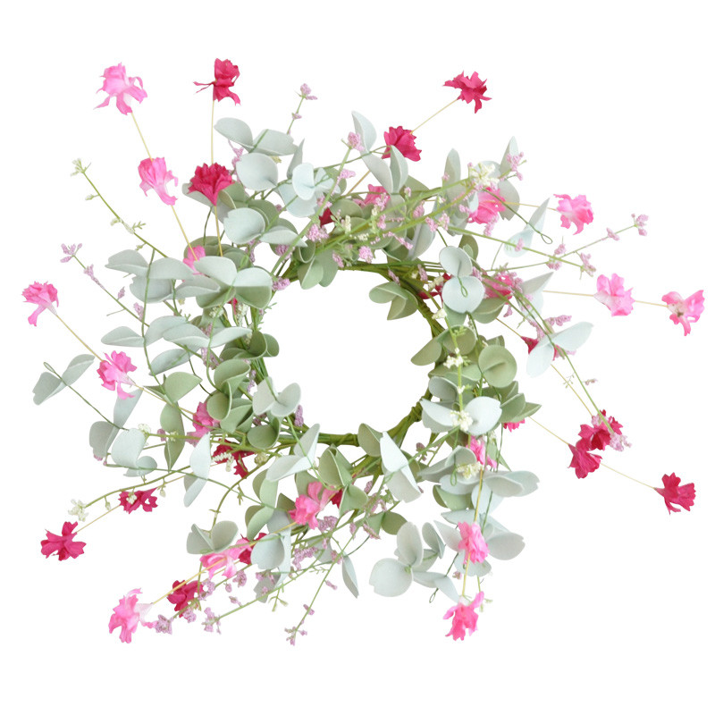 Kukkakranssi, jossa vihreää eukalyptus lehteä sekä pinkkejä kukkia.