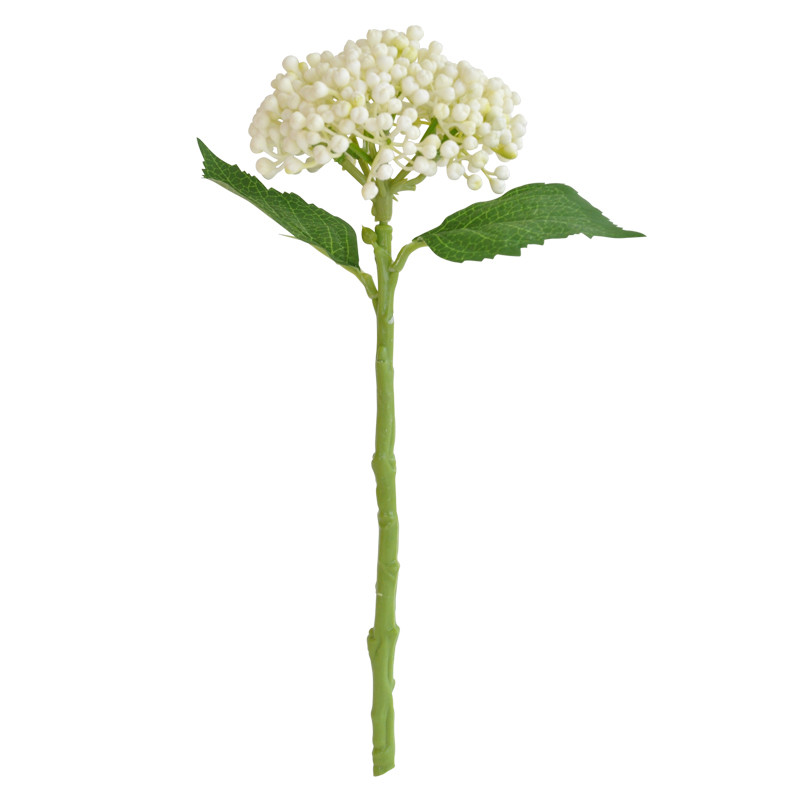 Yksittäinen hortensiaoksa, jossa kukka on vielä nupuilla. Lisäksi kaksi vihreää lehteä.