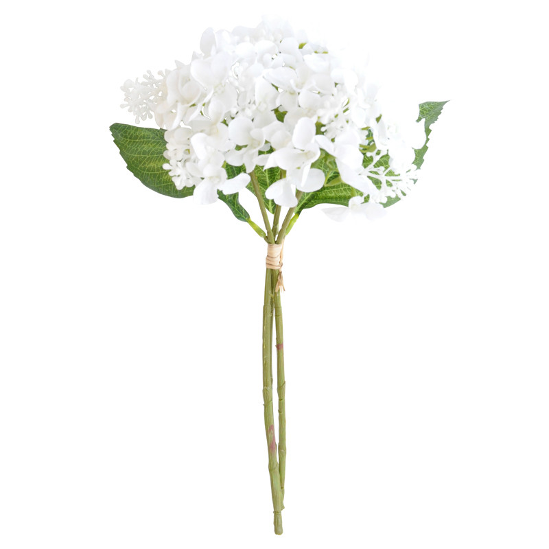 Pieni hortensiakimppu, jossa valkoista kukkaa ja vihreät lehdet.