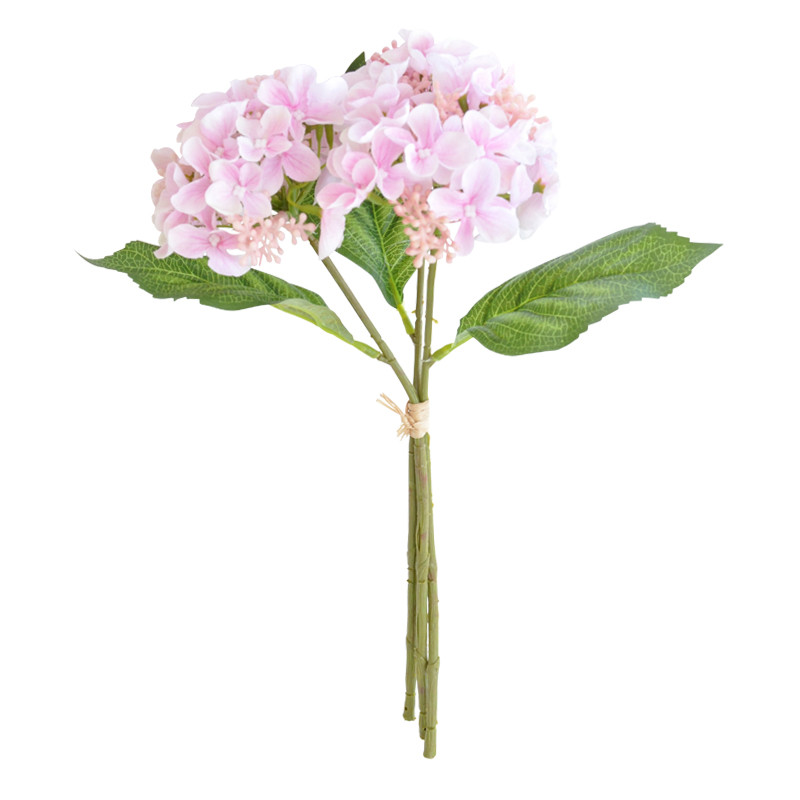 Pieni hortensiakimppu, jossa vaaleanpunaista kukkaa ja vihreät lehdet.