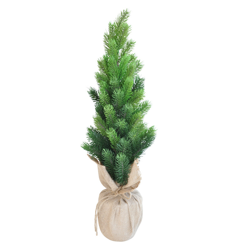 Kapea kuusi juuttikoristeisessa ruukussa.