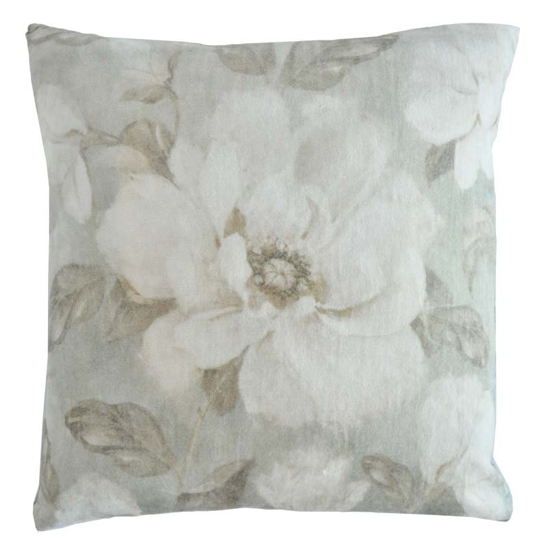 Vaalea kukkakuvioinen tyyny.Kultainen vetoketju.