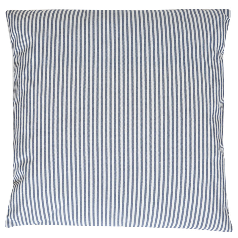 Sisustustyyny, jossa valkoista ja sinistä kapeaa raitaa.