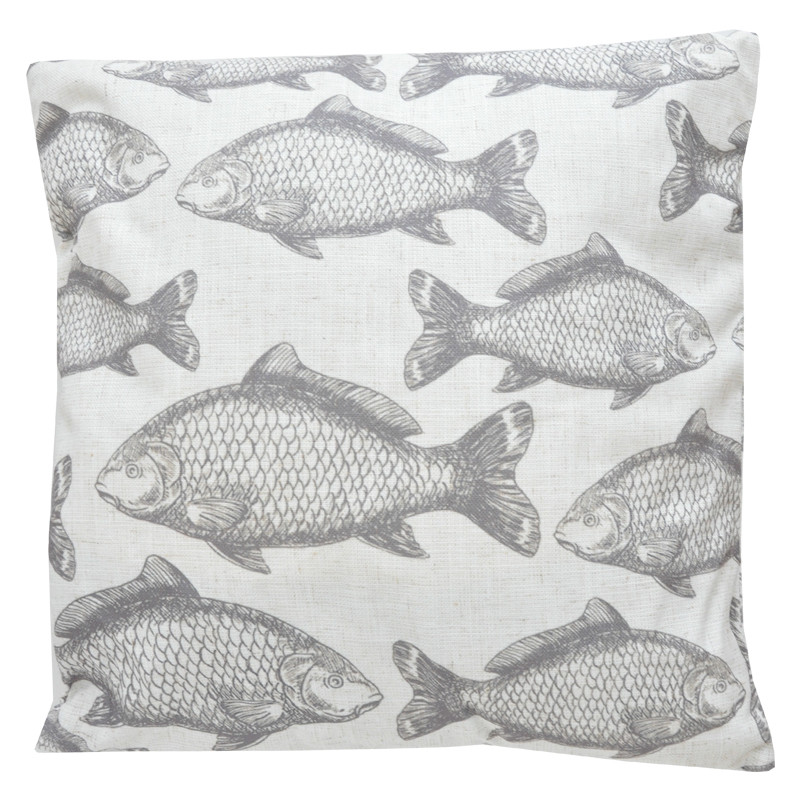 Sisustustyyny, jossa valkoisella pohjalla harmaita kaloja.
