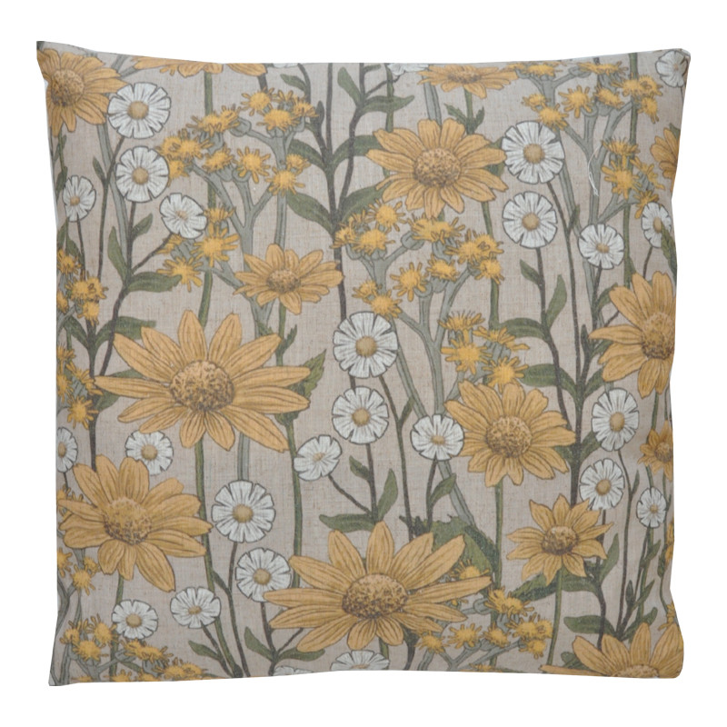 Sisustustyyny, jossa vaaleanbeigellä pohjalla keltaisia ja valkoisia kukkaoksia.