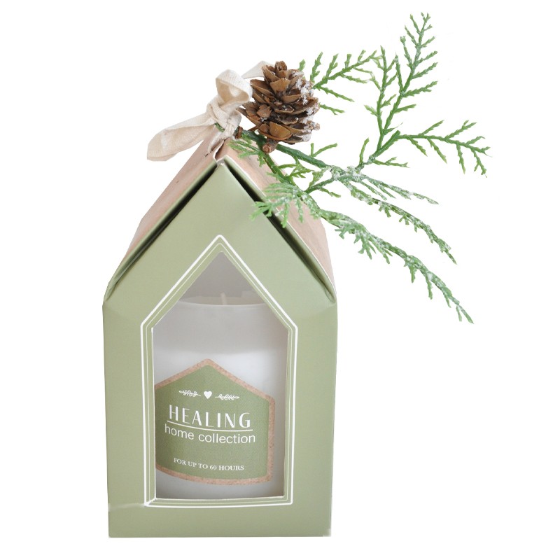 Tuoksukynttilä Wood BreezeLasikynttilä lahjapaketissa & havu/käpy koriste.