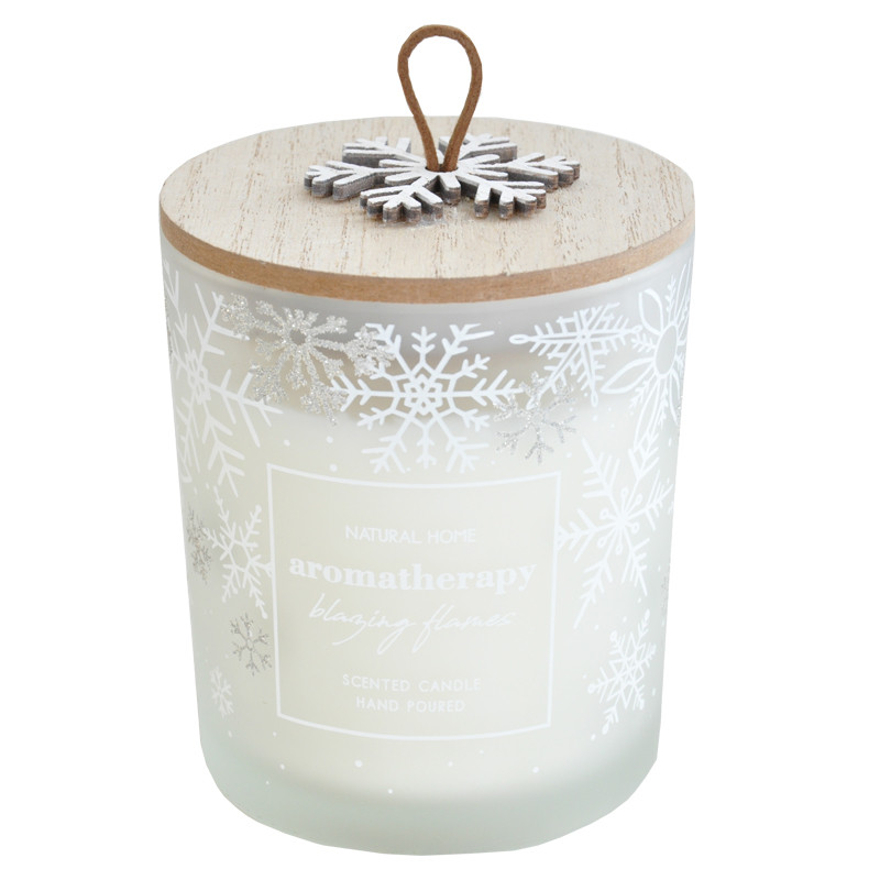 Lasikynttilä, jossa valkoisia ja hopeita lumihiutaleita. Puinen kansi.