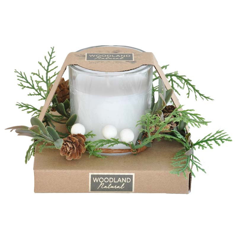 Lasikynttilä ja havu/käpy mansetti pahvisessa paketissa.