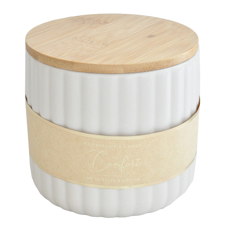 Keraaminen kynttilä, jossa puukansi ja kaunis etiketti.