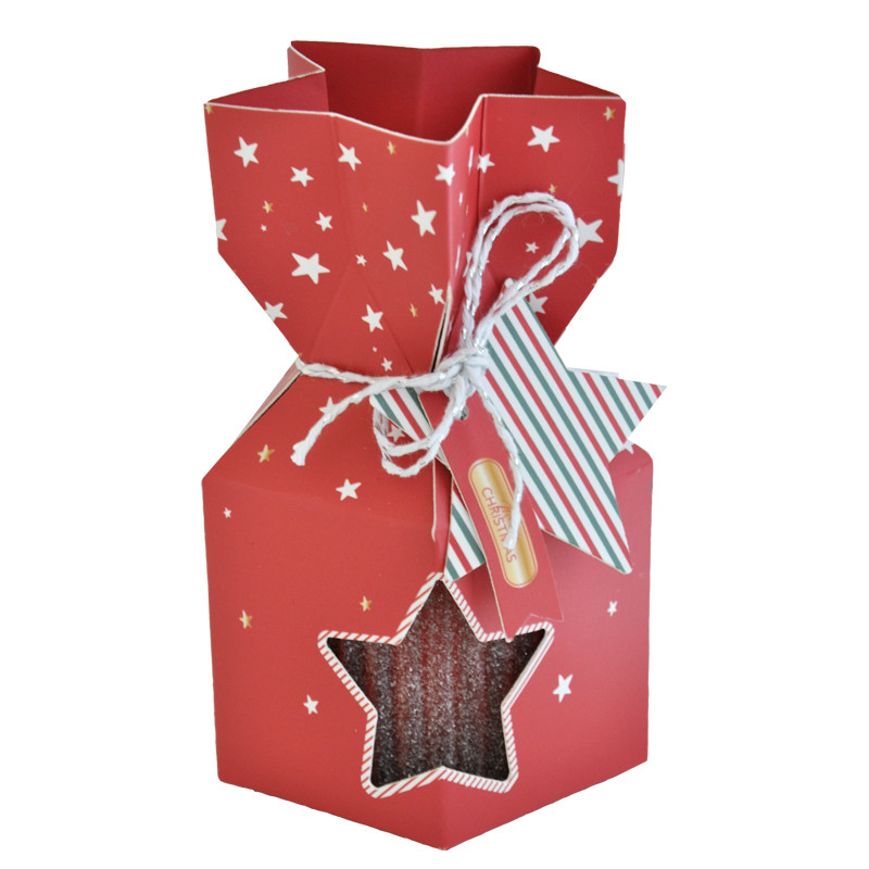 Väri: punainenKynttilä 7x7x6,5 cmPaketti 8,5x8,5x15 cmMateriaali: lasi, parafiini, paketti kartonkia