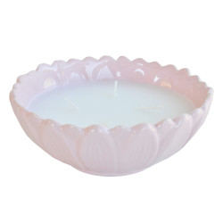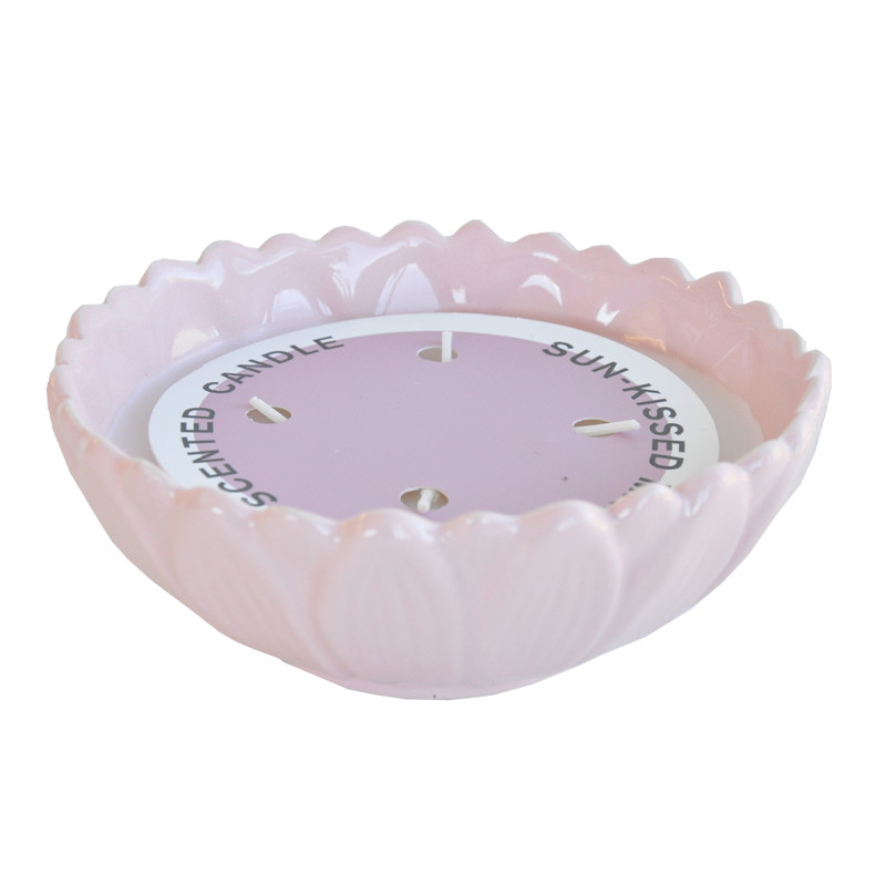 Tuoksukynttilä kukanmuotoisessa keraamisessa kulhossa.