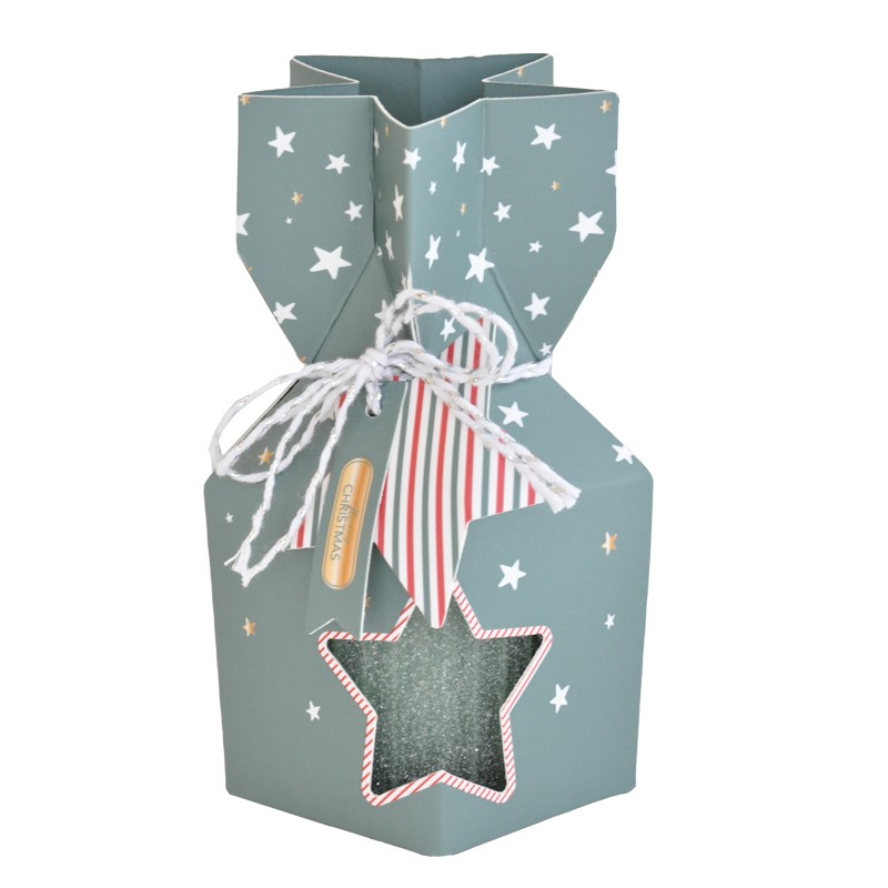 Pyöreä huurrepintainen lasikynttilä lahjapaketissa.